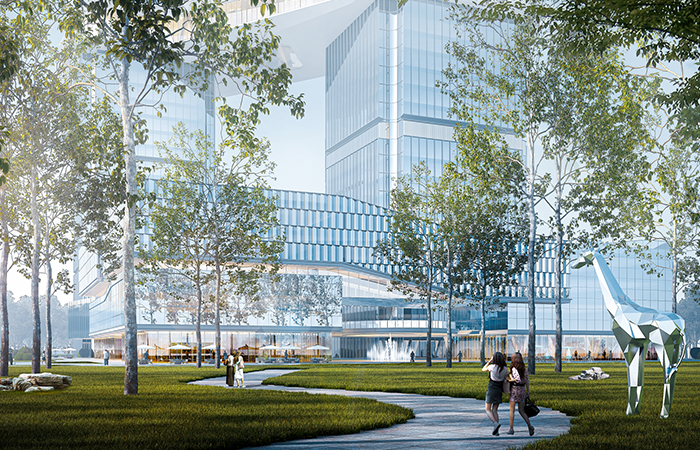 ? ? 北側(cè)塔樓組團(tuán)由約130米超高層及100米高層雙塔攜手構(gòu)成,承載高端商務(wù)辦公功能。雙子塔主體落地,干凈純粹。空中云堂位于雙子塔的黃金分割點(diǎn)處,外形上360度全方位環(huán)繞,將兩棟塔樓連為一體,聚集城市上空視線焦點(diǎn),成為空中新銳會客廳。
