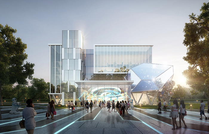 項(xiàng)目以科技“模方”,動(dòng)感“魔石”,智能“膜屏”為設(shè)計(jì)理念, 采用模塊設(shè)計(jì)手法,將模方單元的組合形成虛實(shí)結(jié)合的建筑形態(tài),模方單元內(nèi)白色龍骨陣列排序,打造時(shí)代科技框感;采用不規(guī)則形體設(shè)計(jì)手法,融入能量石的設(shè)計(jì)元素,設(shè)計(jì)中機(jī)器人背抗能量石,增加機(jī)器人與建筑的互動(dòng),打造機(jī)器人智能基地門(mén)戶(hù)標(biāo)致;采用3D裸眼屏等高科技技術(shù)賦予建筑表皮,將科技與智能產(chǎn)品于室內(nèi)室外進(jìn)行多方位展示,打造出獨(dú)一無(wú)二的人工智能IP級(jí)視訊窗口。三種手法的運(yùn)用,共創(chuàng)邯山門(mén)戶(hù)人工智能基地。