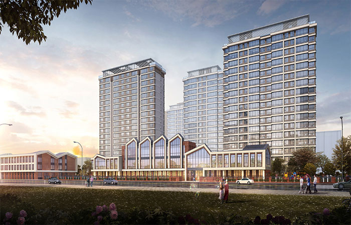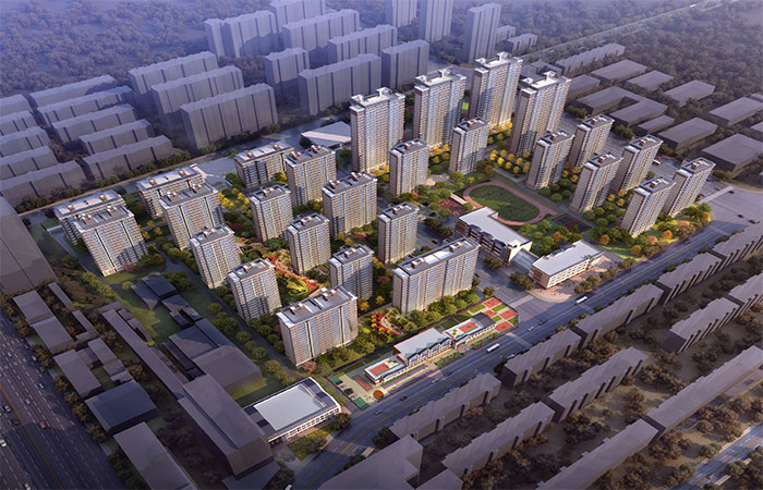 規(guī)劃結(jié)構(gòu)上,利用道路將整體用地劃分為東西兩個(gè)組團(tuán),西側(cè)地塊較為規(guī)整,在地塊中間部分設(shè)置景觀中軸,將幼兒園設(shè)置在采光良好的南側(cè)。建筑立面采用白色與駝色相結(jié)合,打造簡約現(xiàn)代的建筑立面造型,通過對立面分割加強(qiáng)建筑橫向視覺感,運(yùn)用精致簡約的線腳來體現(xiàn)建筑的典雅與華貴,彰顯建筑品質(zhì)。
