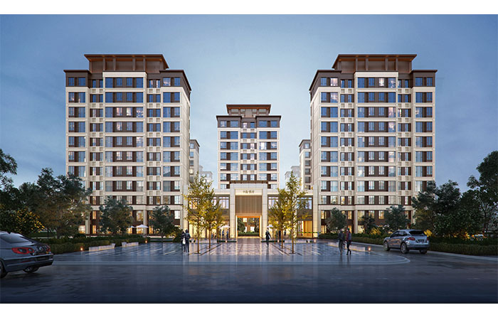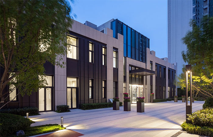 建筑立面整體風(fēng)格以“典雅”的現(xiàn)代主義氣質(zhì)為主,為了保證鮮明的層次感,采用了米黃色石材、真石漆和淺灰色金屬、金屬漆四種材質(zhì),通過選材和構(gòu)造設(shè)計(jì),在極簡的基調(diào)中塑造動(dòng)人的完整性。整體以框架結(jié)合簡潔的橫向線條的形式構(gòu)成,整體效果簡潔典雅。