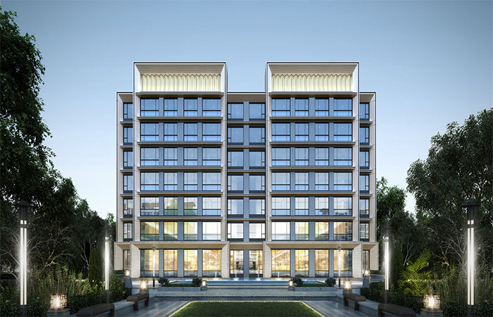 建筑立面造型化零為整,采用米黃色與深灰色作為建筑主色調(diào),簡化瑣碎的線腳裝飾,呈現(xiàn)建筑公建化的穩(wěn)重氣質(zhì)。采用大尺度的豎向線條,整合建筑形象,強(qiáng)化建筑明確的符號特征,沿中山路形成明確的標(biāo)識性和宏大的公建感體量。