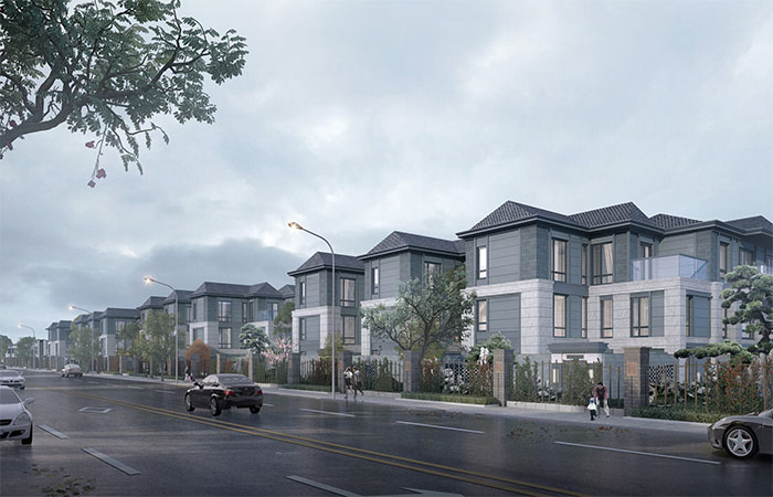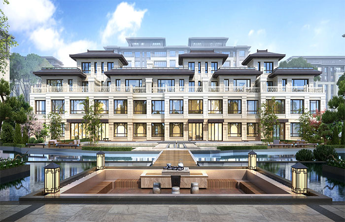 建筑風格為新中式,立面顏色主要有灰色、深咖色、淺米色組成,設計優(yōu)雅大氣,富有格調。