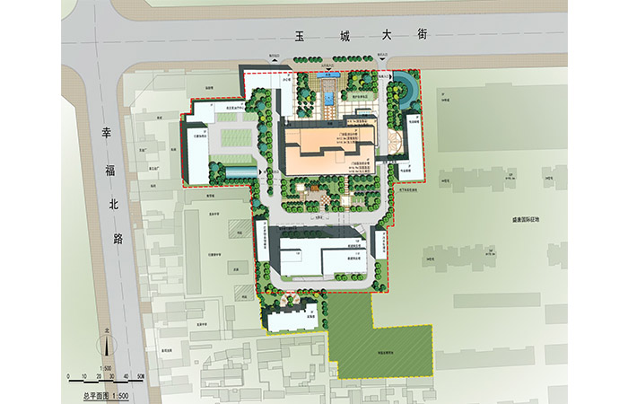 在總平面布局上,該設(shè)計主要以規(guī)整式布局為主,結(jié)合原有地形采用自然式布局,做到規(guī)整與自然式相結(jié)合,為病人提良好的就醫(yī)環(huán)境。本著合理安排資源和服務(wù)廣大人民群眾的基礎(chǔ)上,合理布局。新建門診醫(yī)技綜合樓位于整個地塊中部,北側(cè)規(guī)劃設(shè)計為開敞廣場并與道路相連,西側(cè)為行唐縣急救站,東側(cè)為傳染病樓,南側(cè)為病房樓。