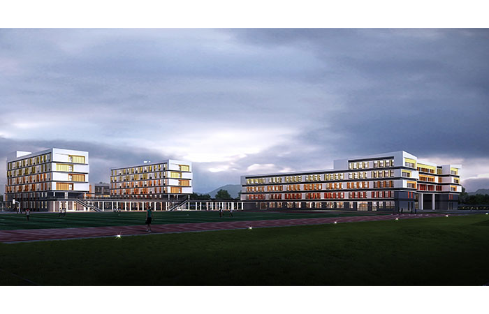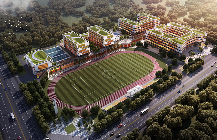 學(xué)校外立面隱喻書海,像許多本書堆疊在一起,形成書海綠洲;校園東側(cè)擁有大片綠海,便于學(xué)生親近自然,擁抱綠色,形成學(xué)習(xí)森林。中部風(fēng)雨連廊首層架空,結(jié)合中部觀景平臺(tái)提供給學(xué)生更多的共享灰空間;北側(cè)風(fēng)雨操場(chǎng)、學(xué)生宿舍與南側(cè)教學(xué)樓、綜合樓通過(guò)連廊成為一個(gè)建筑整體,結(jié)合西側(cè)操場(chǎng)和東側(cè)生態(tài)園形成立體樂(lè)園。最終創(chuàng)造一所混合性、體驗(yàn)性、人文性和生態(tài)性多功能細(xì)化互融的新型學(xué)校。