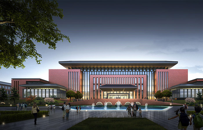 建筑外墻采用磚紅色與米白色相互碰撞映襯,形成典雅靈動的視覺對比,以仿石漆、石材、Low-E中空玻璃為主要裝飾材料,突出建筑精工細作、開拓創(chuàng)新的工匠精神。