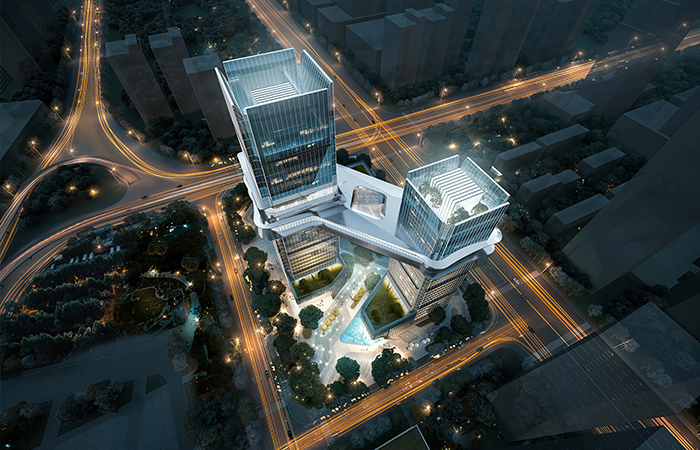 ? ? 雙子塔樓:塔樓整體采用修長的建筑線條勾勒形體,采用幾何分段式強(qiáng)調(diào)建筑垂拔高聳的公建姿態(tài);轉(zhuǎn)角部采用內(nèi)凹收分,摹畫建筑修長體型;頂部采用舒展的切面開合,塑造建筑挺拔上升質(zhì)感;材質(zhì)上采用不同通透率的玻璃幕墻強(qiáng)調(diào)建筑體量美感。