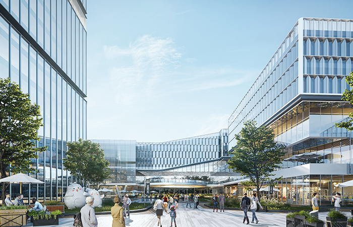 ? ? 北側(cè)塔樓組團(tuán)由約130米超高層及100米高層雙塔攜手構(gòu)成,承載高端商務(wù)辦公功能。雙子塔主體落地,干凈純粹。空中云堂位于雙子塔的黃金分割點(diǎn)處,外形上360度全方位環(huán)繞,將兩棟塔樓連為一體,聚集城市上空視線焦點(diǎn),成為空中新銳會客廳。