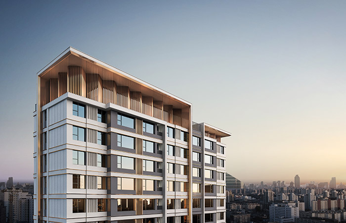 住宅立面采用簡(jiǎn)潔的水平線條與挺拔豎向線條形成對(duì)比,打造經(jīng)典、簡(jiǎn)約的立面風(fēng)格。在近人尺度部位、檐口、頂部造型等,采用金屬鋁板、金屬線條等高品質(zhì)材料打造。建筑色彩分區(qū)規(guī)劃,結(jié)合低彩度、高明度的米白、淺灰、淺咖等色彩,整體形成豐富有序的城市界面。