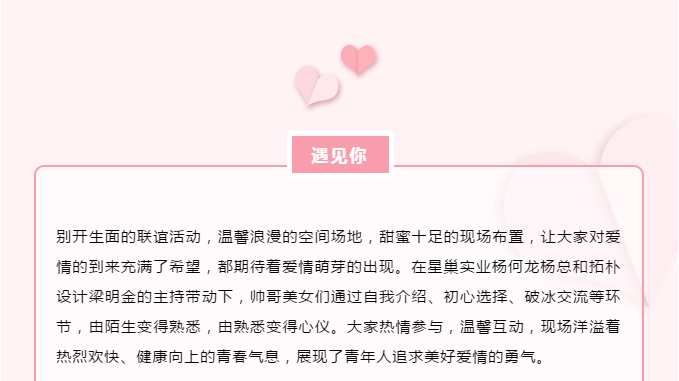 以“心動(dòng)大者 緣定今生”為主題的青年聯(lián)誼交友會(huì)。遇見(jiàn)你預(yù)見(jiàn)愛(ài),開(kāi)啟你的心動(dòng)模式。