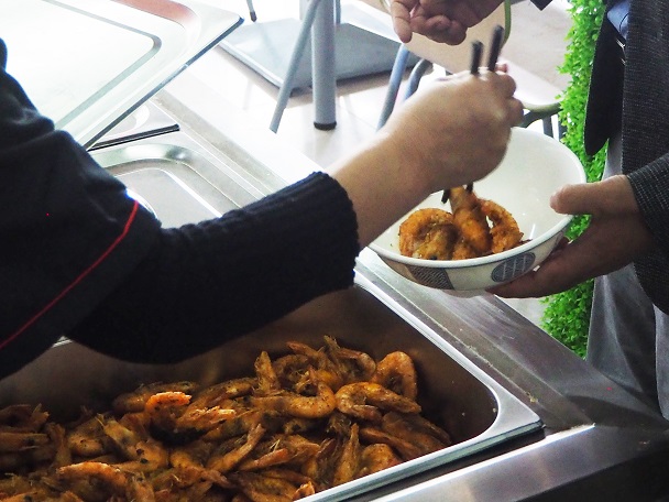 飯點(diǎn)一到,大家就都開始有序排隊(duì)選餐,工作一上午,