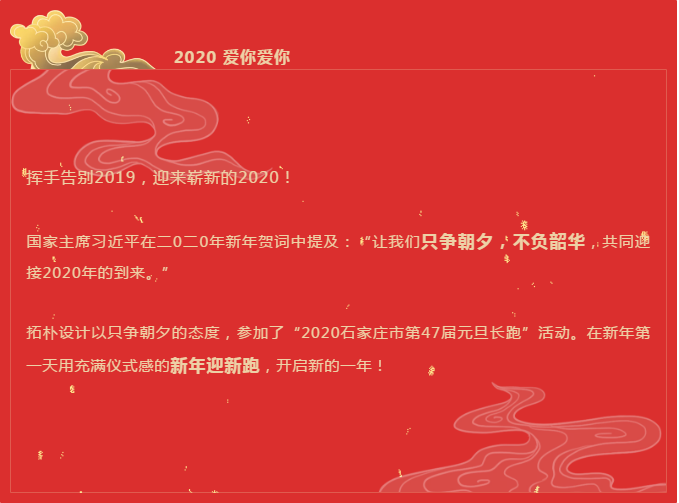 毛總寄語說到:“希望大家在新的一年身體健壯,精力飽滿,健康生活。在奮力工作的同時保證身體健康和生活品質(zhì),這是拓樸設計一直以來希望戰(zhàn)友們所追求的,畢竟身體健康才是一切的根本。新年新希望,我們大家一起努力,一起奮斗!”